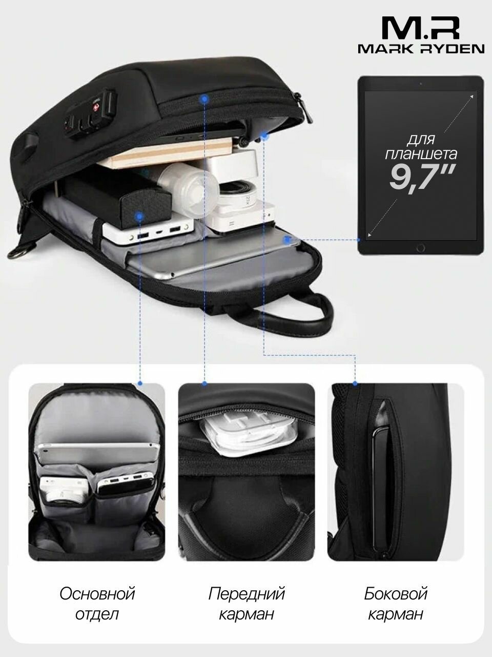 Рюкзак однолямочный с кодовым замком Mark Ryden MR7039 - Черный