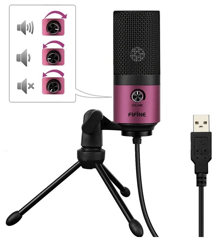 Микрофон FIFINE K669 (розовый, на штативе, USB 5V, 20Hz-20kHz, -34dB±30% (1kHz), S/N 78dB, шнур 1.8 м, рег. громкости)