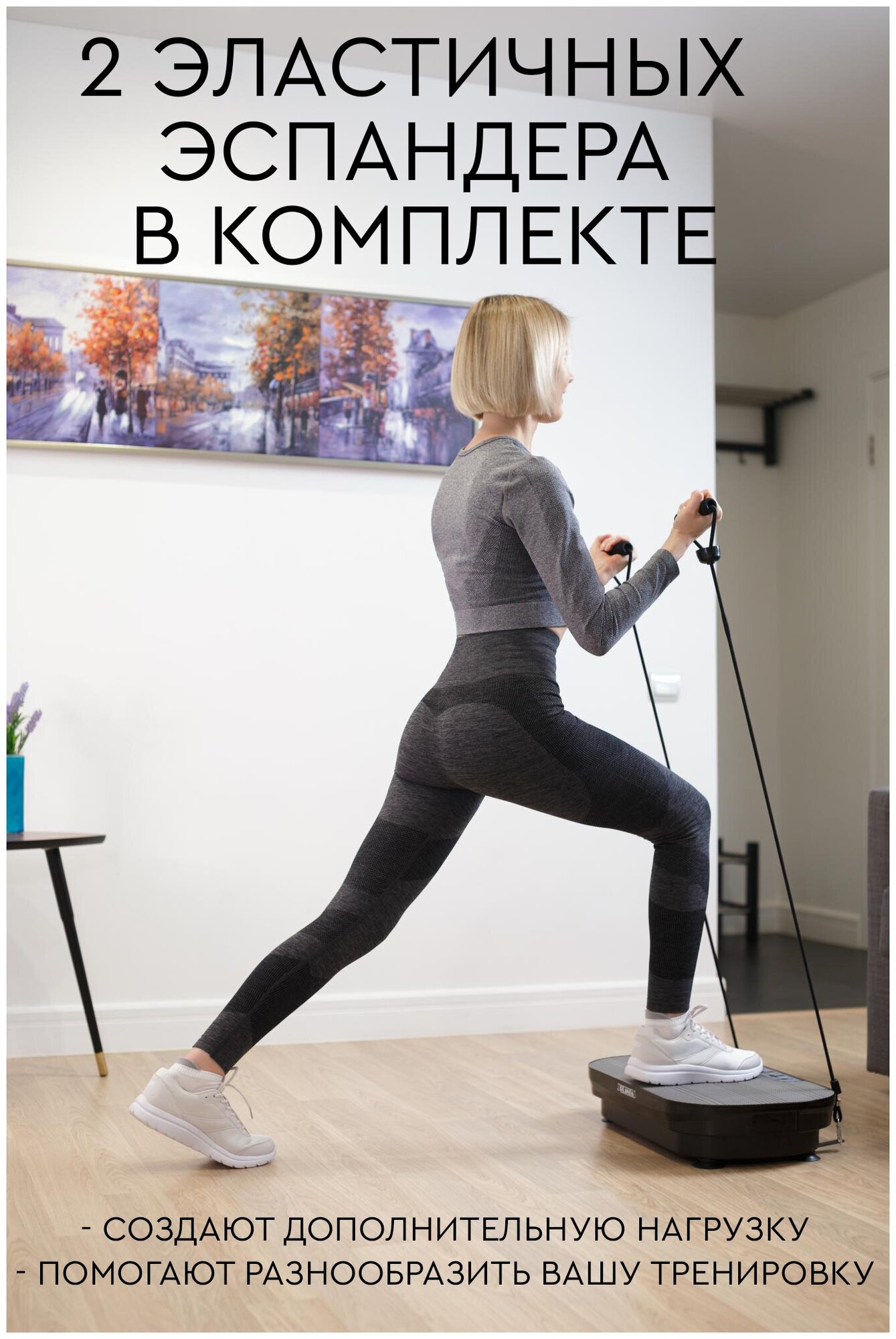 | Отзыв: | Несмотря на то, что виброплатформа сделана из пластика, никаких замечаний к ней нет, поскольку качество на высоте. Стоимость для такой вещи приемлемая. Скорости переключать не трудно, впрочем как и программы. Для дополнительной нагрузки при тренировке есть эспандеры – с ними я раньше не работала, делают тренировку труднее но эффективнее. Прибор советую. |