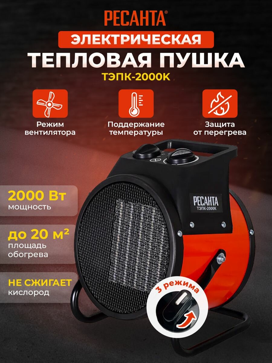 Тепловая пушка напольная Ресанта ТЭПК-2000K, тепловентилятор, сетевой обогреватель электрический обдувочный, отопление для дома, гаража, нагревательный элемент керамический, с термостатом