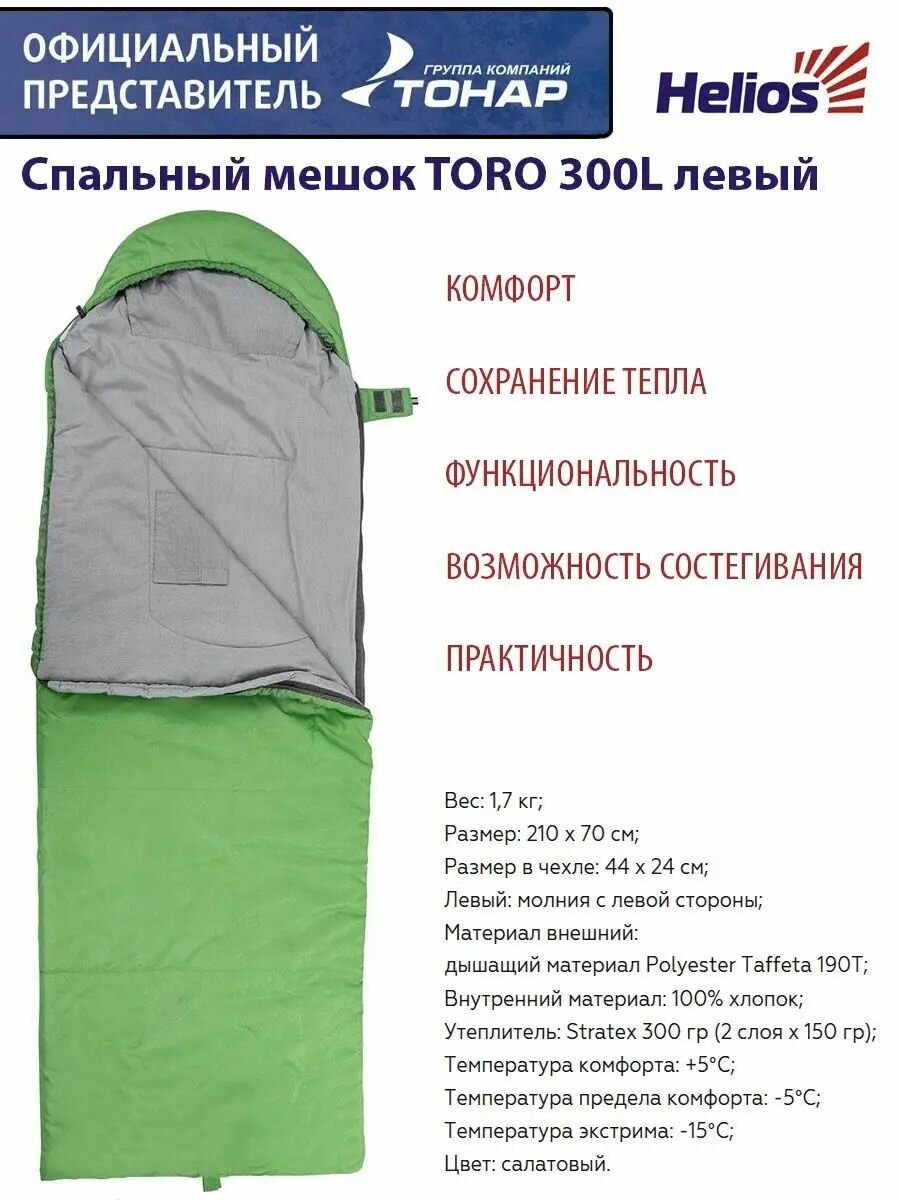 Спальный мешок TORO 300L (210*70, левый, стратекс, салатовый) Helios (T-HS-SB-T-300L)