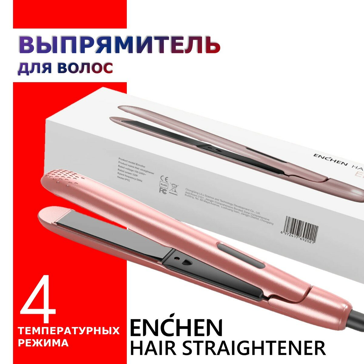 Выпрямитель Enchen Enrollor Hair curling, 32 Вт, керамическое покрытие, до 200 C, розовый Enchen 96 .
