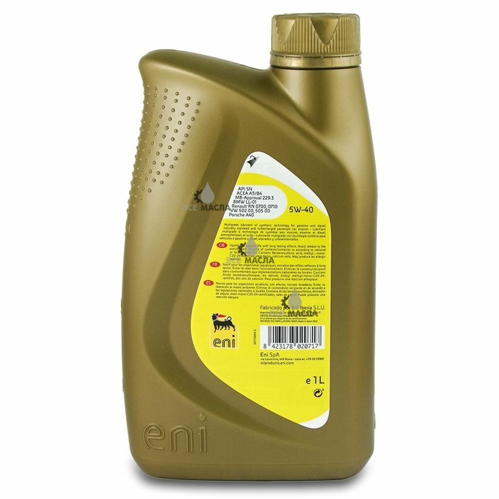 Масло моторное синтетическое 60л - для легковых автомобилей API SN, ACEA A3/B4, VW 502.00/505.00, BMW LL-01, MB 229.3,229.5, Porsche A40, RN 0700/0710,PSA B71 2296 ENI ENI 5W40 I-SINT/60 | цена за 1 шт | минимальный заказ 1