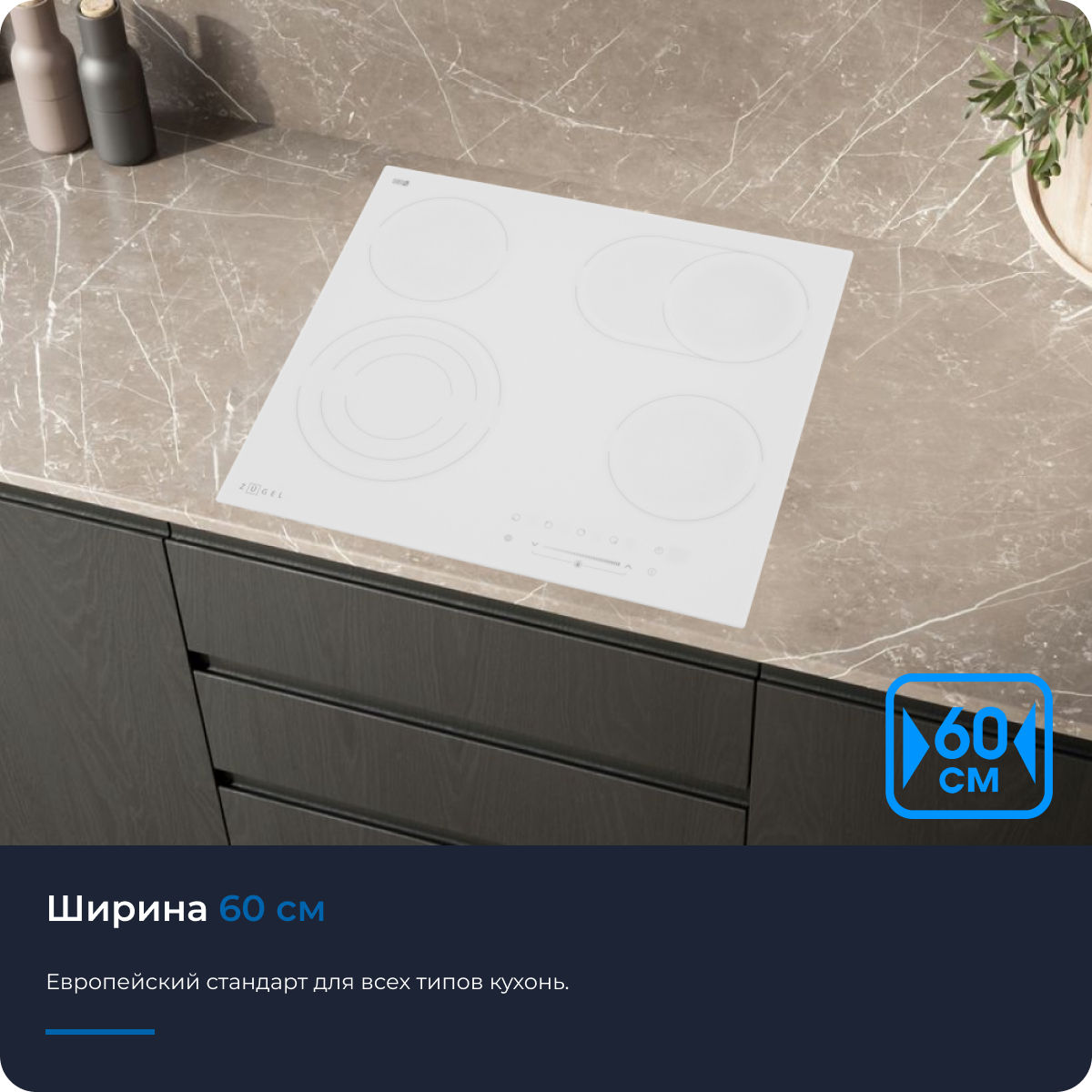 Электрическая варочная панель ZUGEL ZEH603W, 6700 Вт, 4 конфорки Hi Light, сенсорное управление, 9 уровней мощности, стеклокерамика, белый