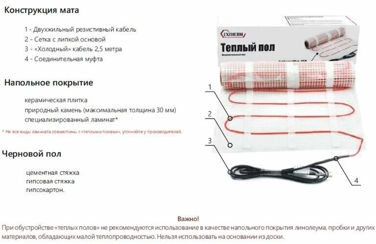 Комплект Теплый пол (мат) двухжил. 150Вт/кв. м ExthermMat 450Вт 6х0.5м 3кв. м ExthermMat 150-450-3.0, 1УП.1 шт