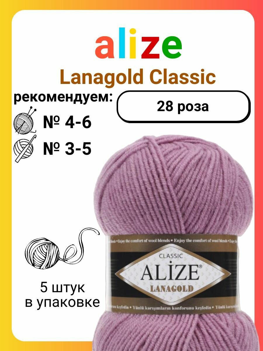 Купить Пряжа Alize Lanagold, 49 % шерсть, 51 % акрил, 100 г, 240 м, 5 шт., 28 роза