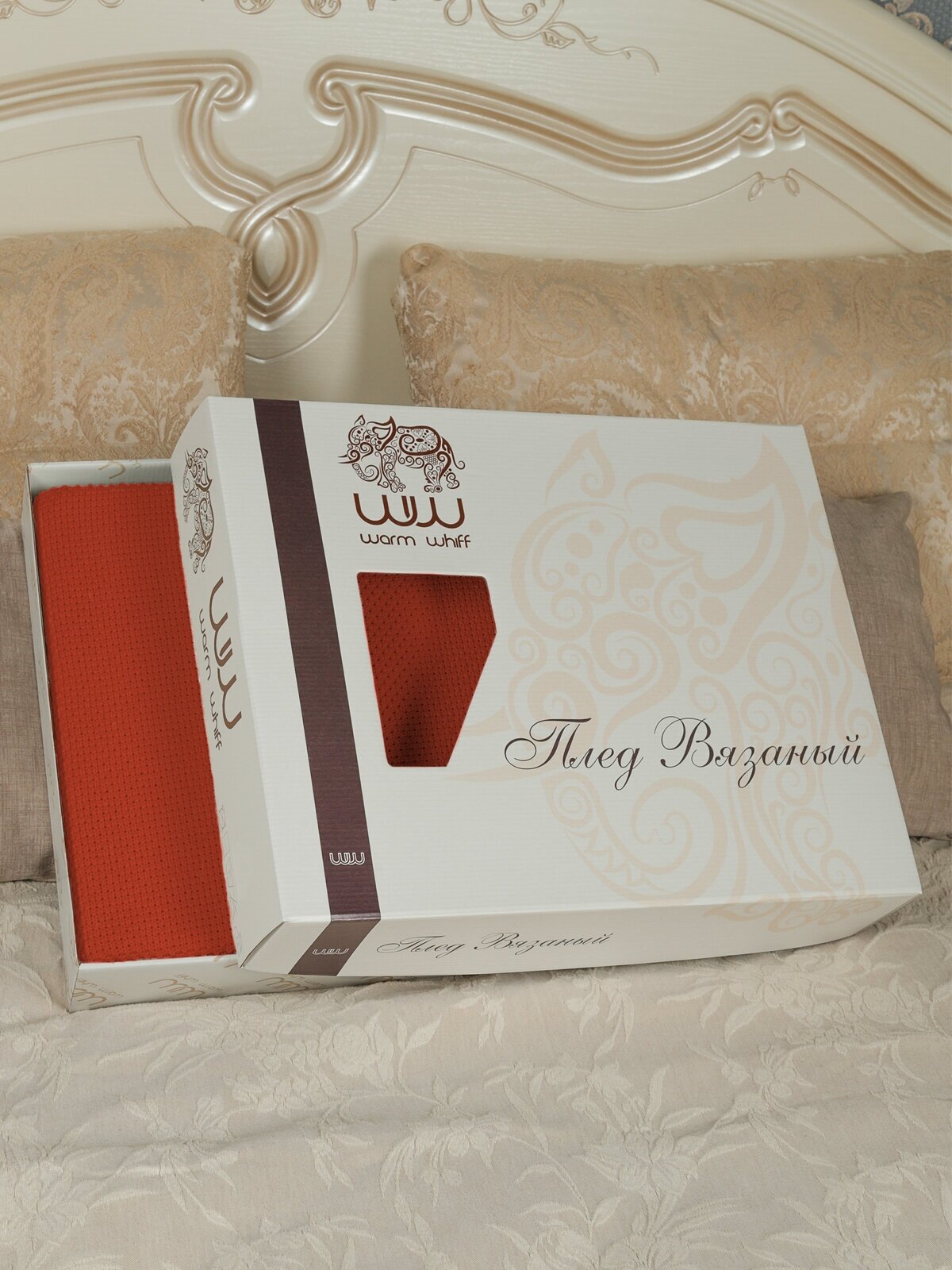 Плед, вязаный, новогодний, Warm Whiff, коричневый, 180х220, хлопок 100%, покрывало на кровать, на диван, на кресло, большой, тонкий, красивый, нежный, в подарочной коробке