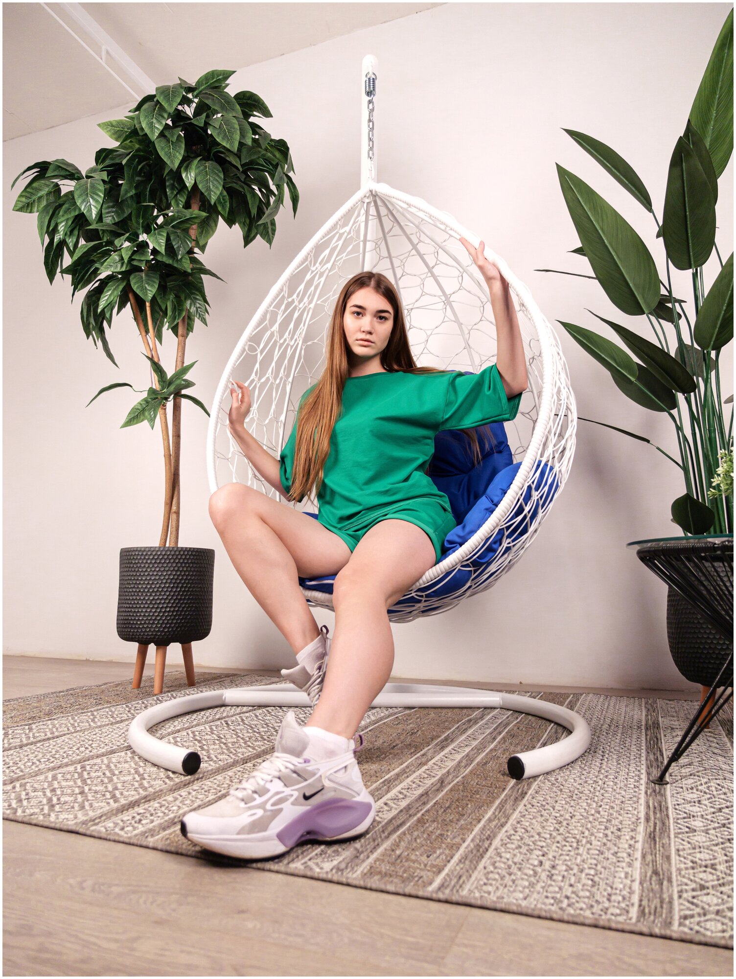 СохранитьПодвесное кресло капля с ротангом белое, голубая подушка интересное: