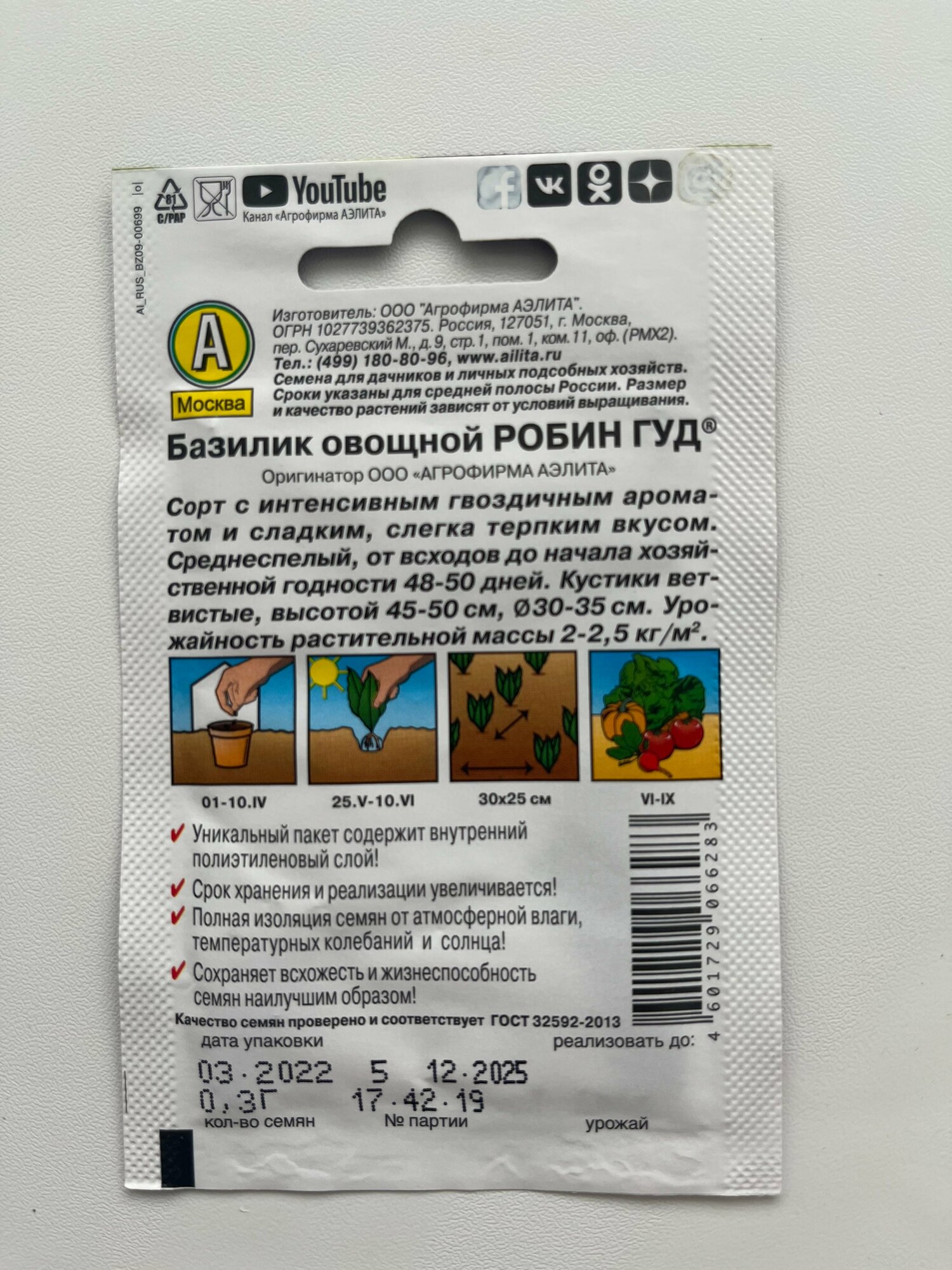 Семена Базилик овощной Робин Гуд 0,3 гр. интересное: