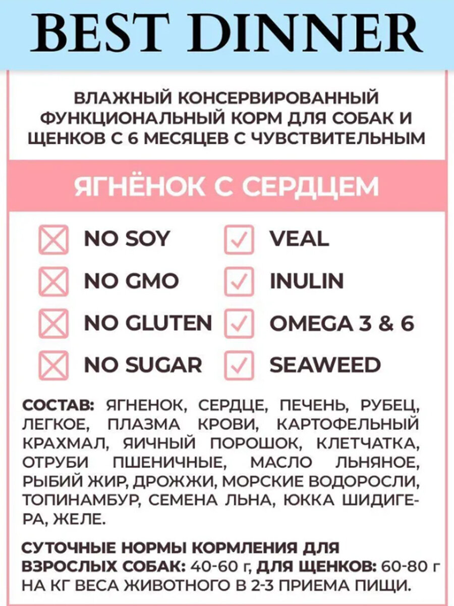 Корм влажный Best Dinner для собак Ягненок с сердцем 100г 15% , 1 шт