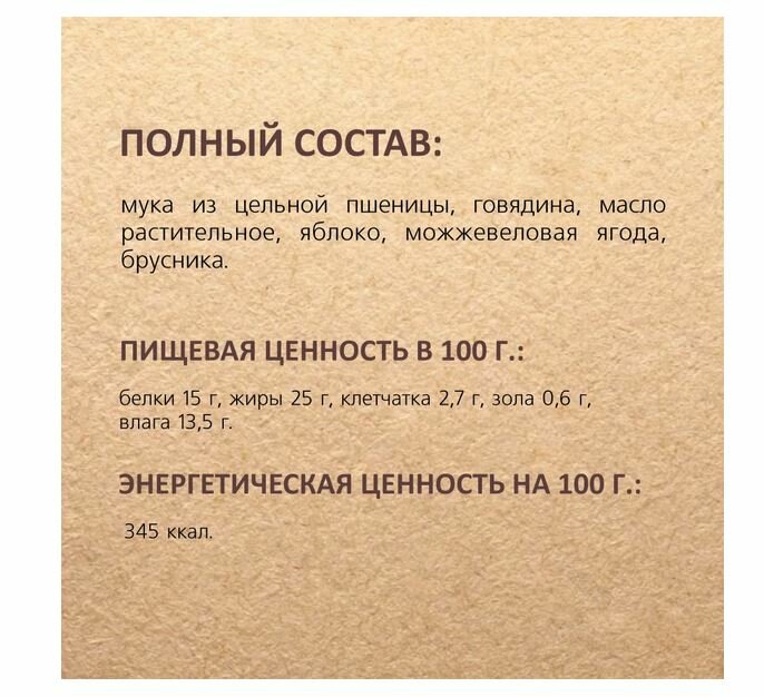 | Плюсы: | Удобная форма печенья, собака обожает их. В составе злаки, мясо говядины, ягоды. |