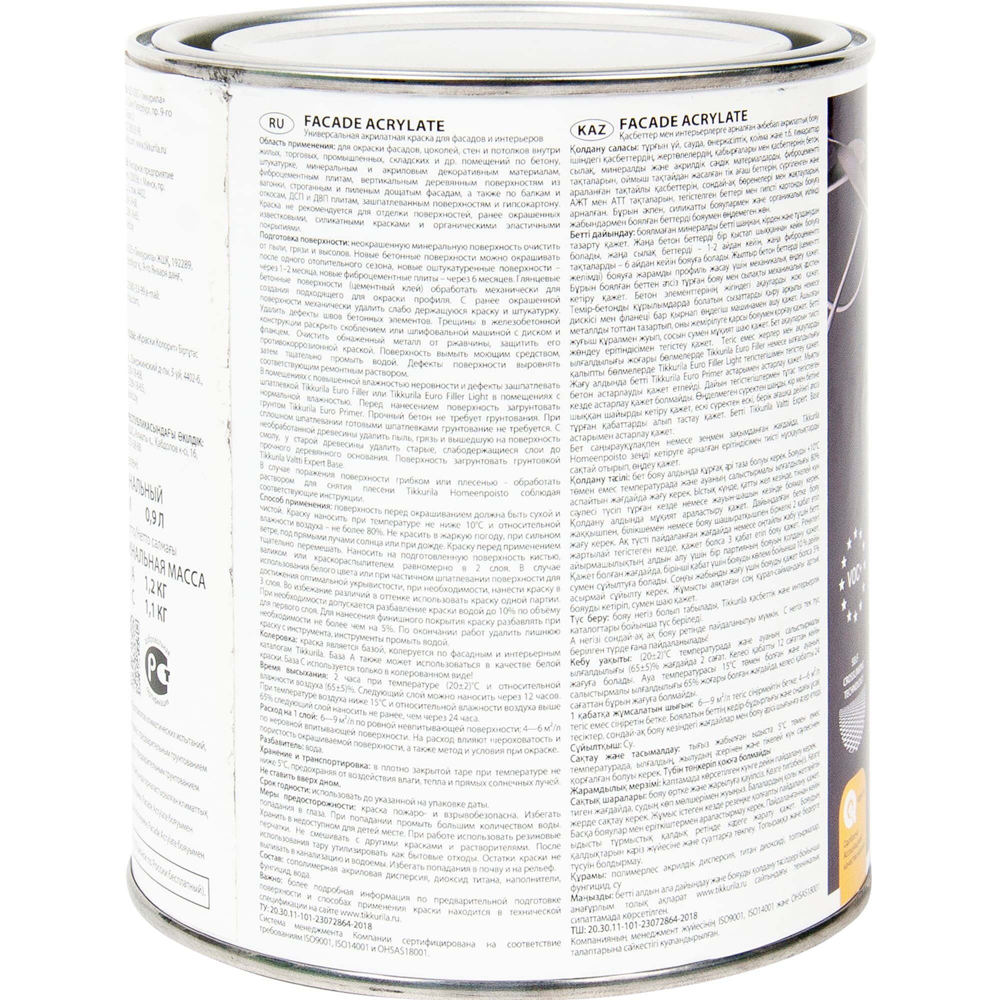 Купить краска акрилатная фасадная TIKKURILA Facade Acrylate база С 0,9л бесцветная, арт.700012343