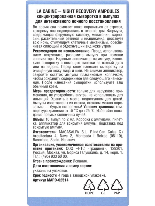 Концентрированная сыворотка, la Cabine, Night recovery ampoules, в ампулах для интенсивного ночного восстановления, 1х2 мл