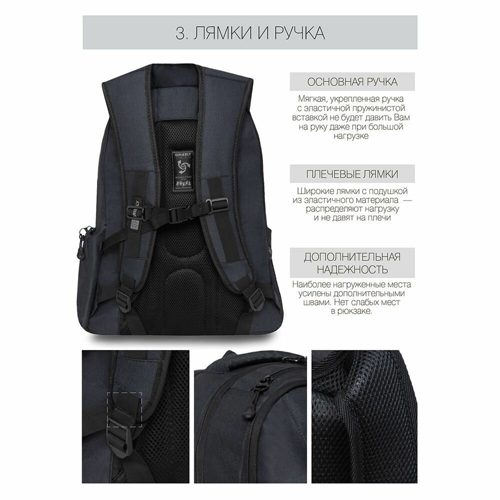 Рюкзак молодежный GRIZZLY мужской на молнии с анатомической спинкой и двумя отделениями и карманом для ноутбука RQ-903-21/3 черный (58629) интересное: