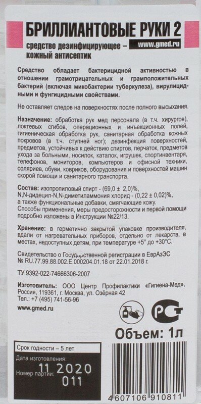 ООО ЦП гигиена МЕД Бриллиантовые Руки-2 5 л. Дезинфекция кожных покровов УТ000001036