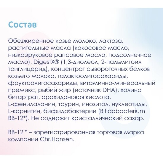 | Содержит | козье молоко / пребиотики / пробиотики |