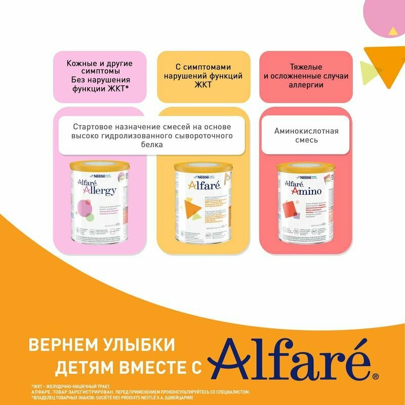 Смесь Alfare (Nestle) Allergy с олигосахаридами, при аллергии на белок коровьего молока (абкм), с рождения, 400 г