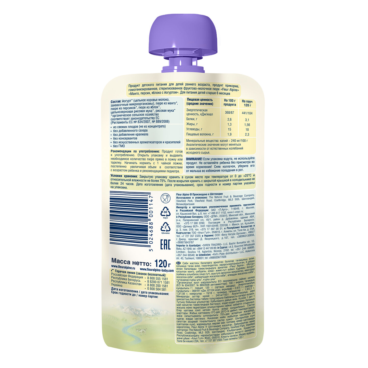 Купить Пюре детское Fleur Alpine манго, персик, яблоко с йогуртом и цельными злаками, с 6 месяцев, 120 г (6 штук)
