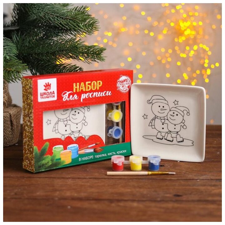 Купить Школа талантов Набор тарелка под раскраску "Снеговички" краска 3 цв по 2 мл, кисть