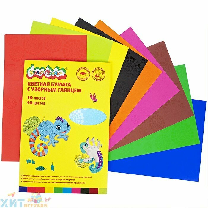Цветная бумага Каляка-Маляка 1-сторонняя, глянец с узором, 10 л истов, 10 цветов, 170 г/м2, А4, 190х290 мм (БЦГКМ10)