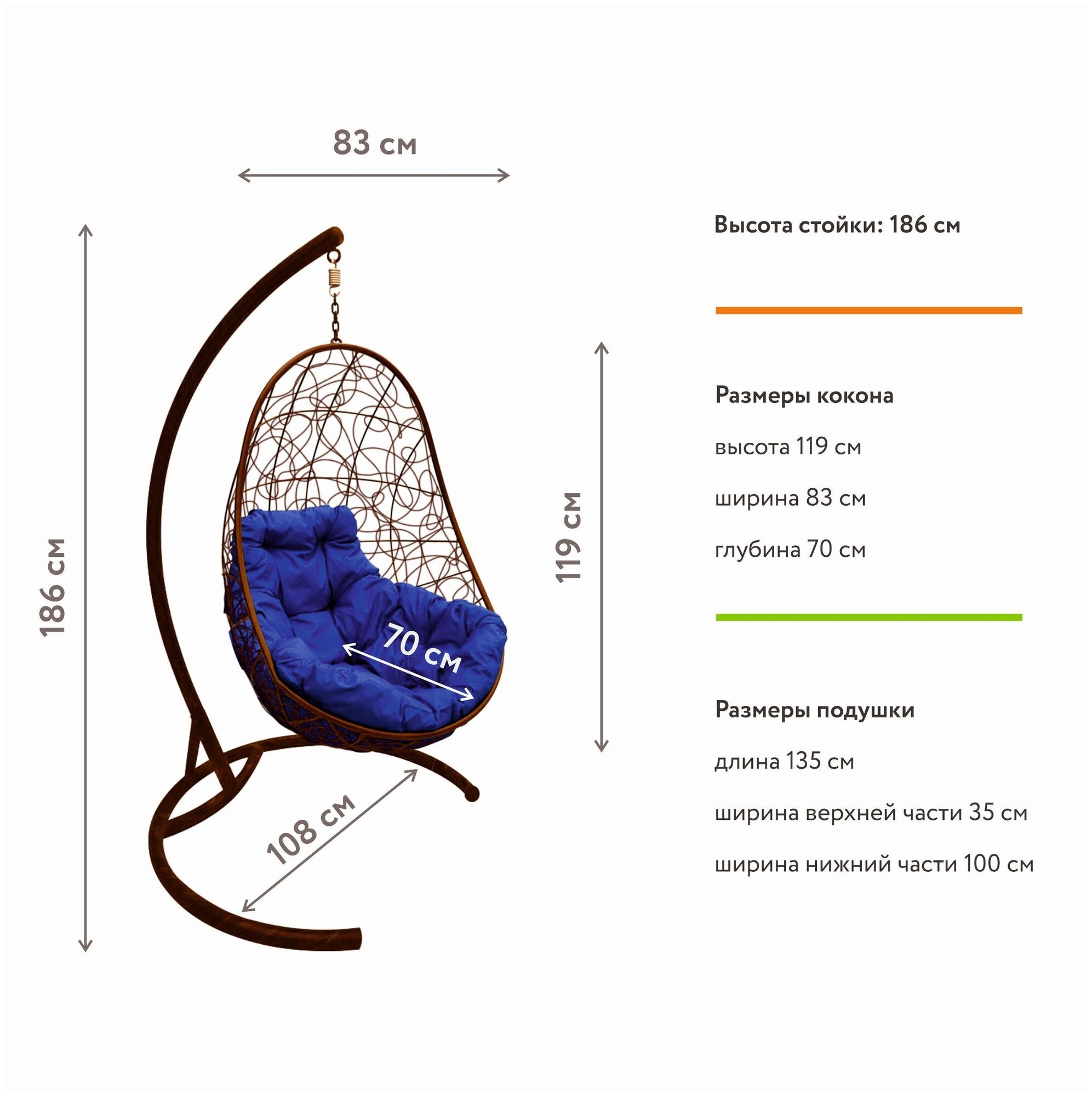 Кокон местами облез, оплётка с желтизной, про непрокрасы молчу! Единственный плюс подушка, действительно на вид хорошая Кроме того не указан размер основания, специально приобретался узкий кокон 84см зато основание 104см! Теперь не помещается на балконе |