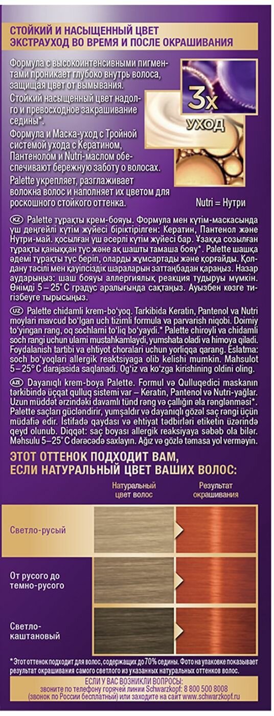 Палетт Стойкая крем-краска Интенсивный цвет, KR7 7-77 Роскошный медный, 110 мл - 3 шт