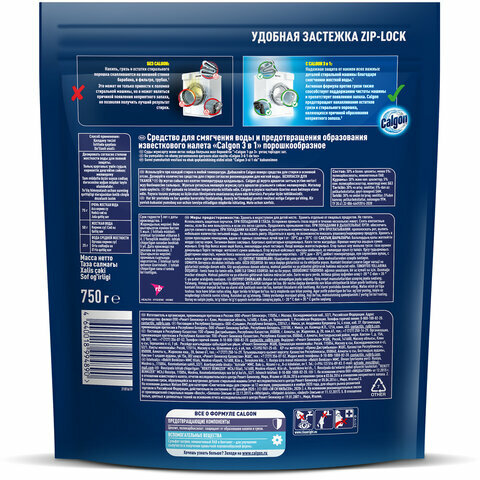 | Способ применения | используйте при каждой стирке и любой температуре. Добавляйте Calgon поверх средства для стирки в основной отсек. Дозируйте количество средства для стирки согласно рекомендациям для мягкой воды |