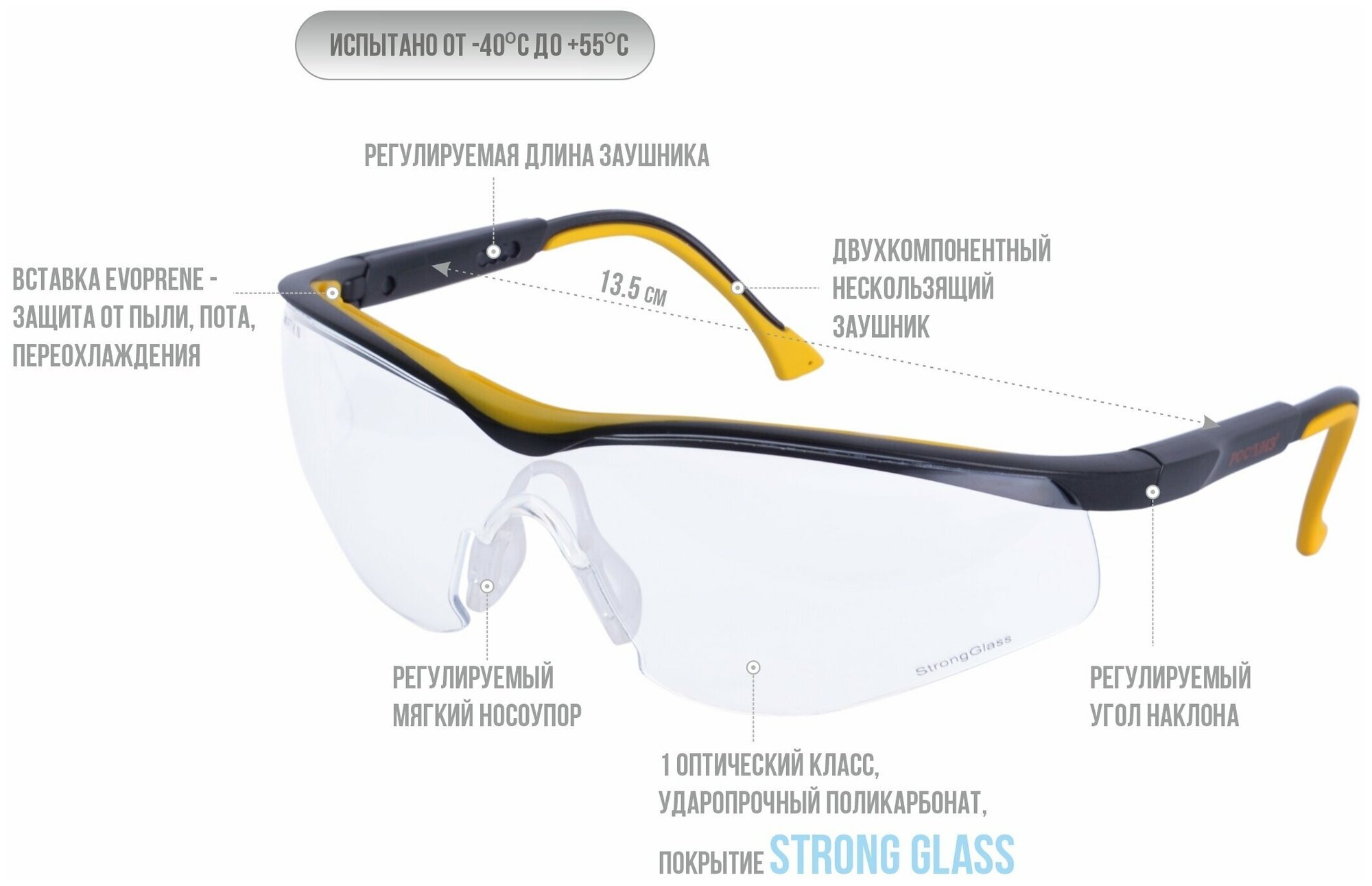 Очки защитные открытые РОСОМЗ О50 Monaco StrongGlass, прозрачные, регулируемые дужки, незапотевающее покрытие, 15037