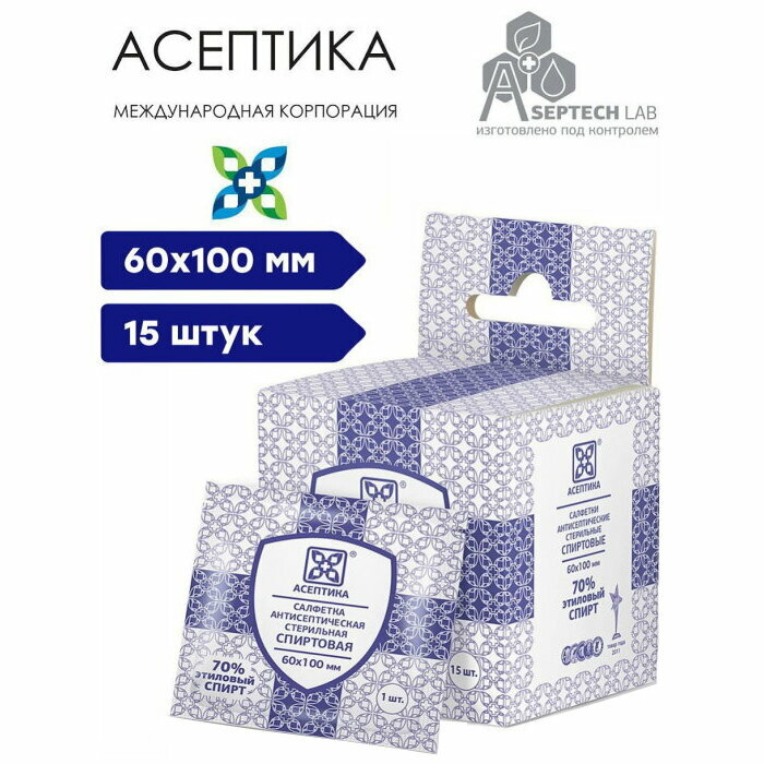 Купить Салфетки антисептические стерильные спиртовые Асептика 15 штук (Размер 60 х 100 мм.) саше