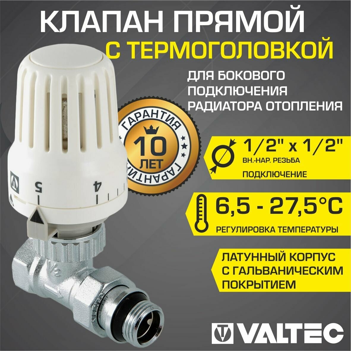 Клапан (вентиль) термостатический прямой Valtec (VT.048.N.04) 1/2 НР(ш) х 1/2 ВР(г) для радиатора с термоголовкой