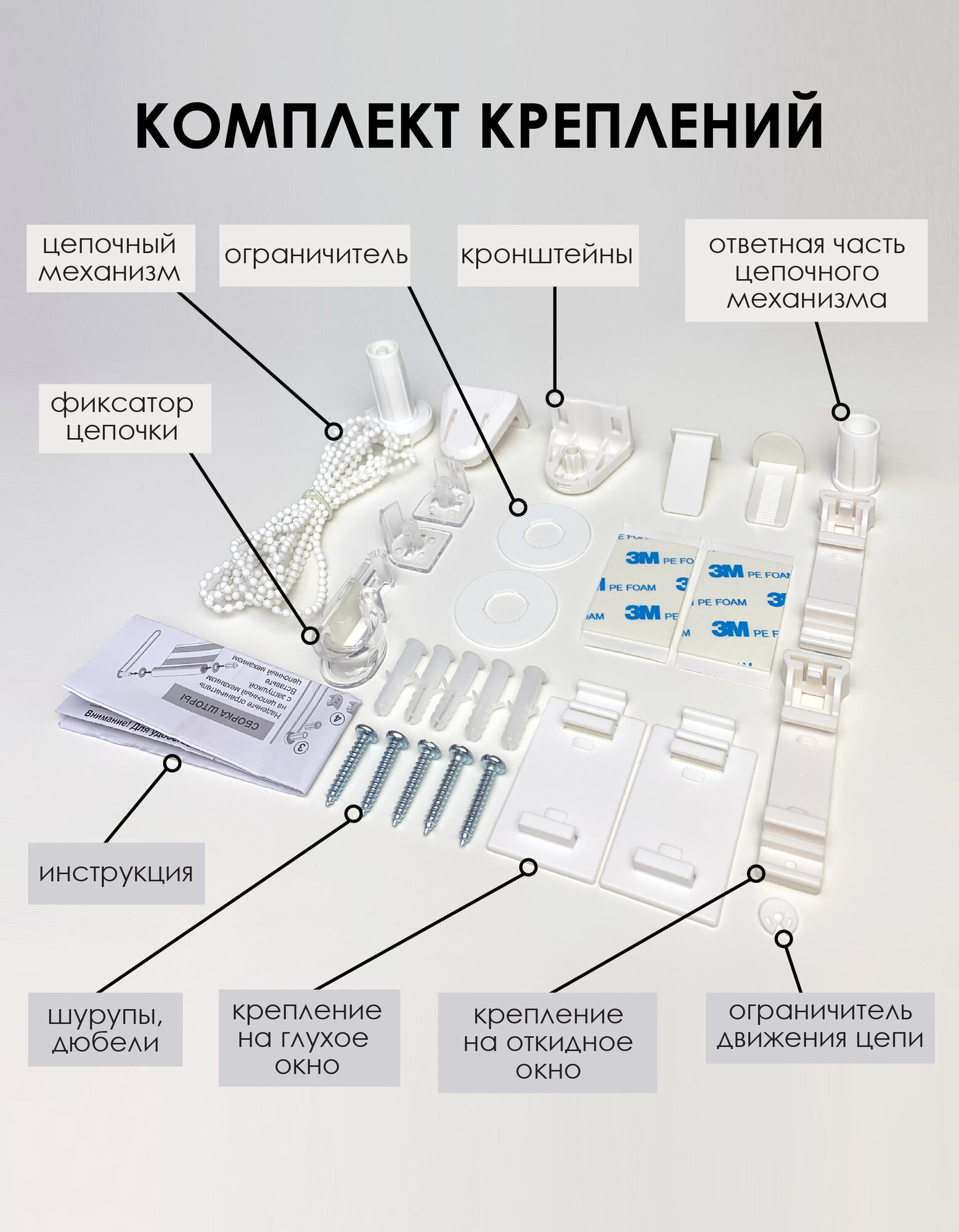 | Комплектация | штора "День-ночь" с трубой, ограничитель, цепочный механизм с заглушкой, заглушка-фиксатор, фиксирующая профильная планка, держатели, площадка с двусторонним скотчем, утяжелитель, навесной кронштейн, зажим, шурупы, фиксатор для цепочки |