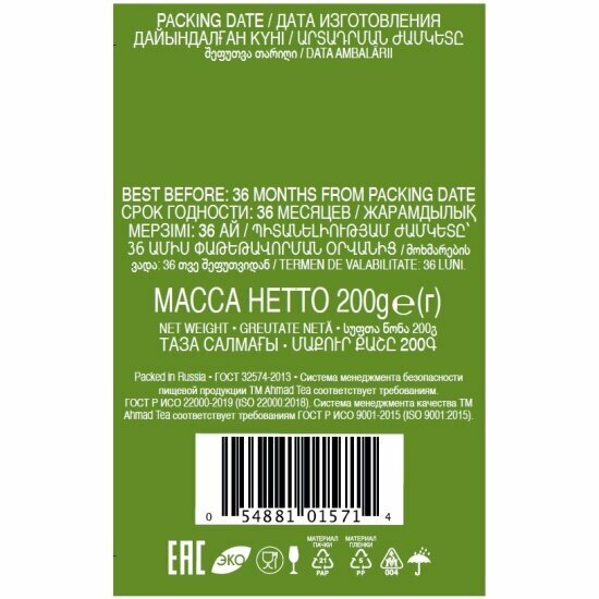 Чай "Ahmad Tea", Чай зеленый «Китайский», листовой, картон. коробка, 200г