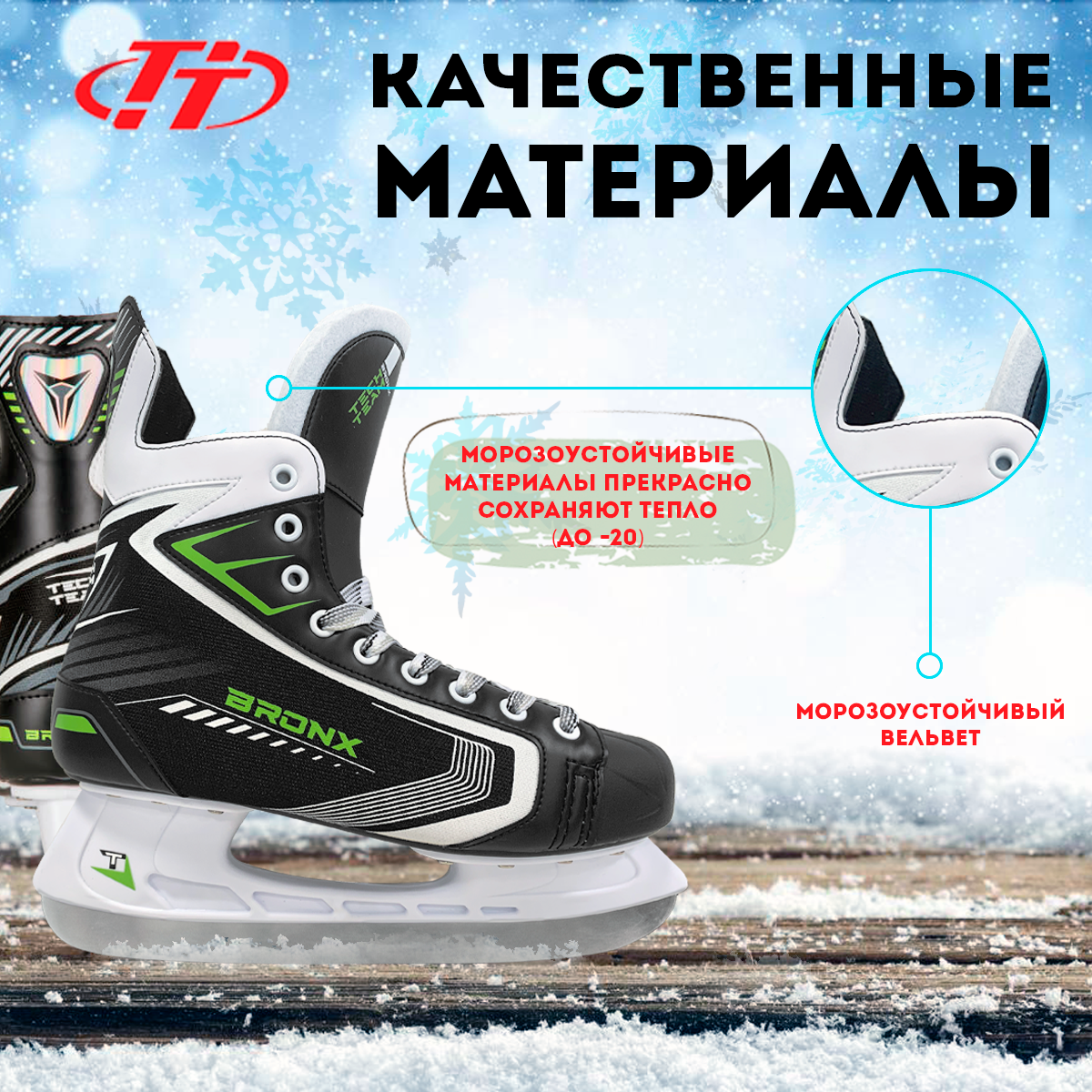 Хоккейные коньки TechTeam BRONX, р. 43, шнурковая фиксация, морозоустойчивые, чёрные