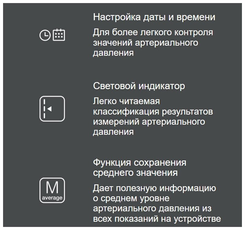 | Особенности | безболезненная манжета / управление одной кнопкой / фиксация даты и времени / шкала ВОЗ |