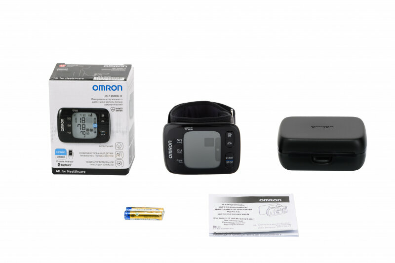 | Комплектация | -Электронный блок тонометра Omron RS7 Intelli IT (HEM-6232T-RU) c физиологической манжетой 13,5 - 21,5 см -Футляр для хранения прибора -Комплект элементов питания, тип AAA x 2 шт. -Руководство по эксплуатации -Гарантийный талон -Инструкция по установке приложения |