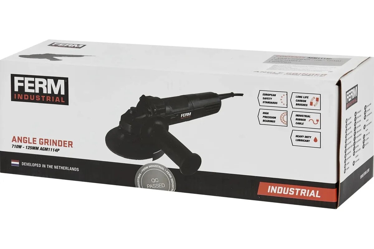 Болгарка, шлифовальная машина угловая УШМ FERM Industrial AGM1114P, 125 мм., 710 Вт., 12000 об.мин., коробка