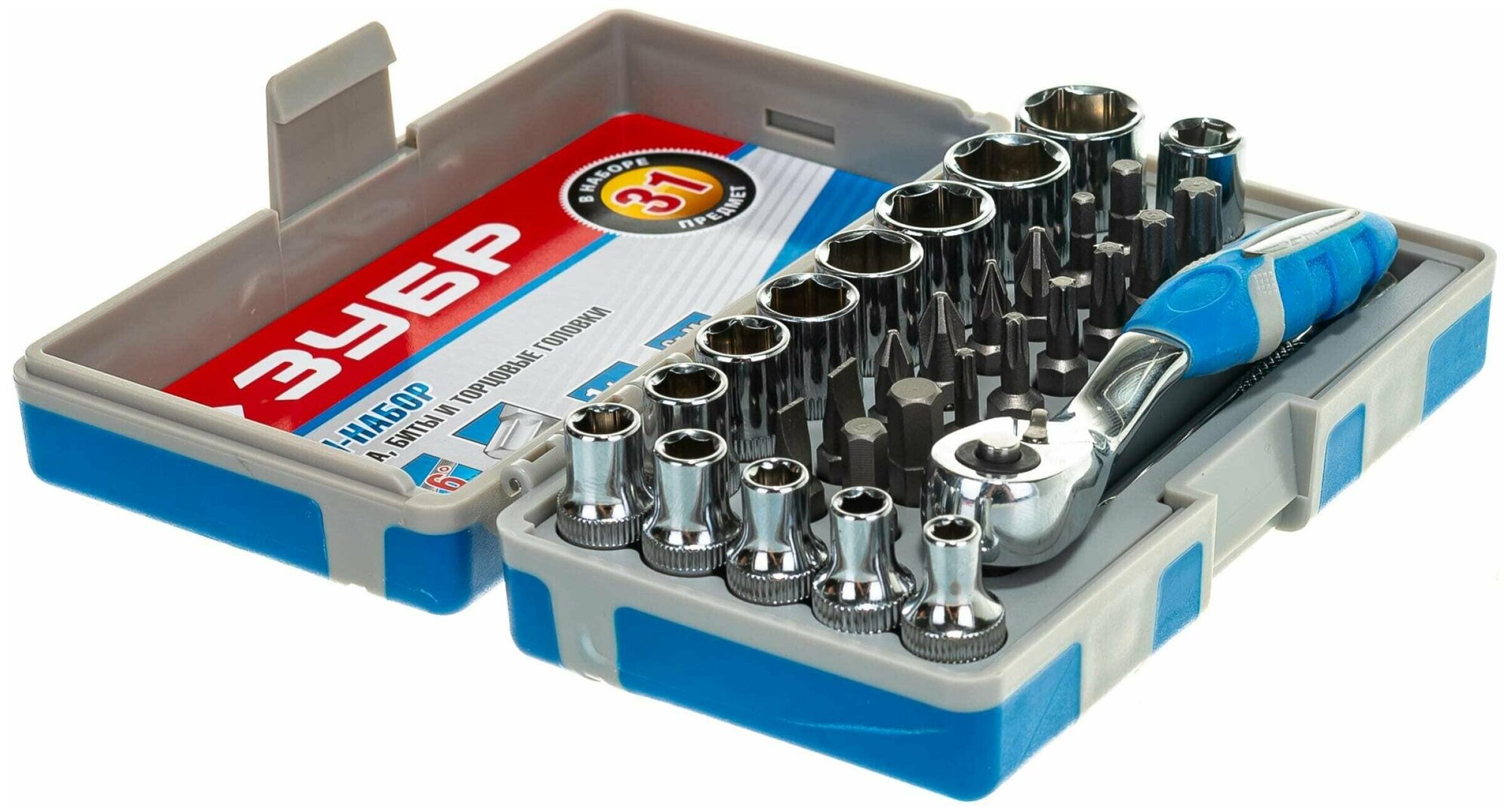 ЗУБР 31 шт., Cr-Mo, набор: трещотка, биты и торцовые головки 26054-H31 Эксперт