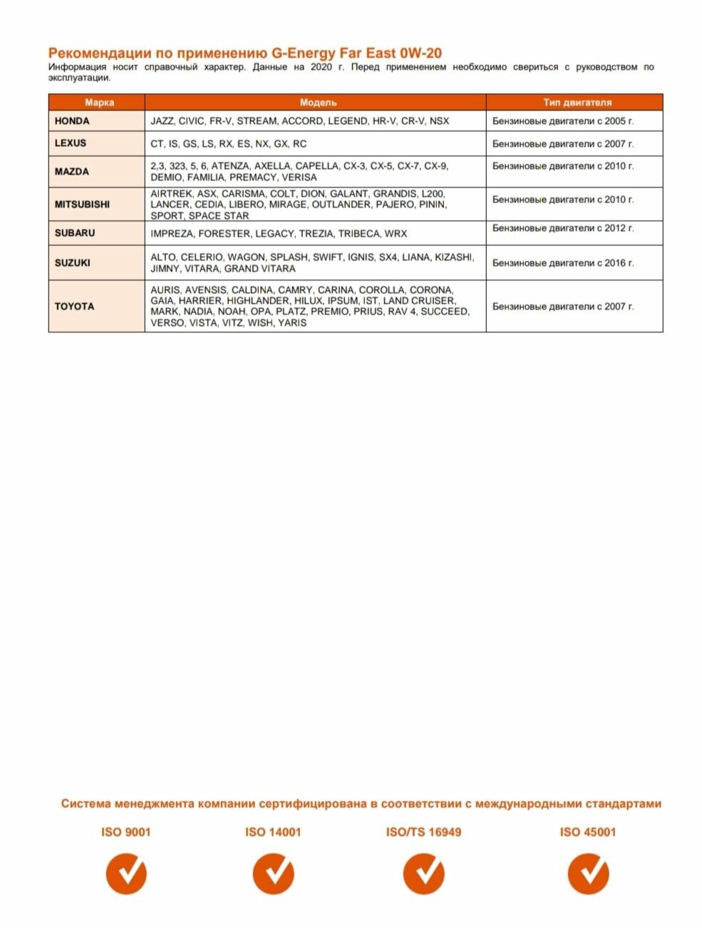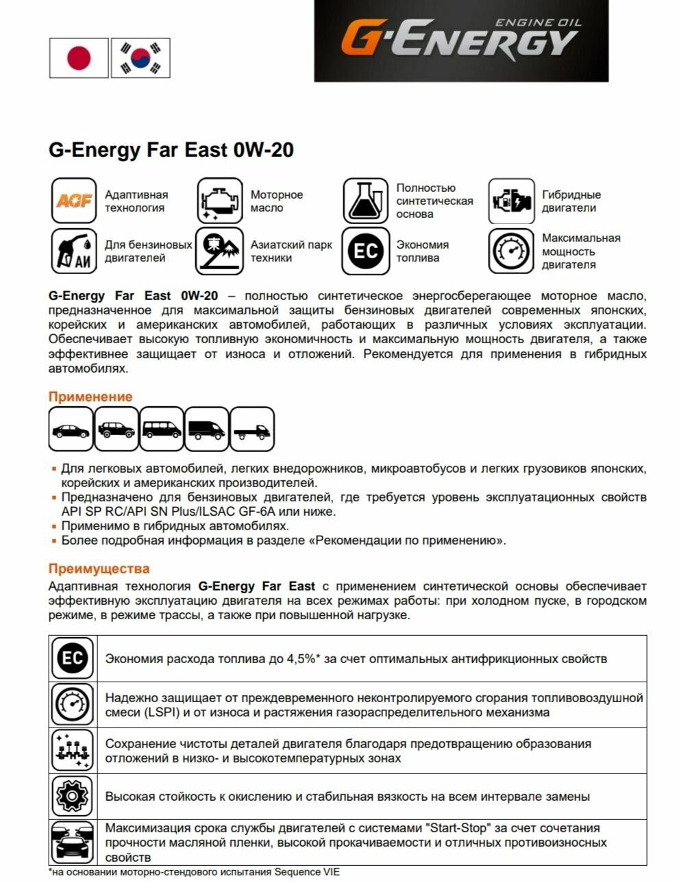 | Класс вязкости SAE | 0W-20 |