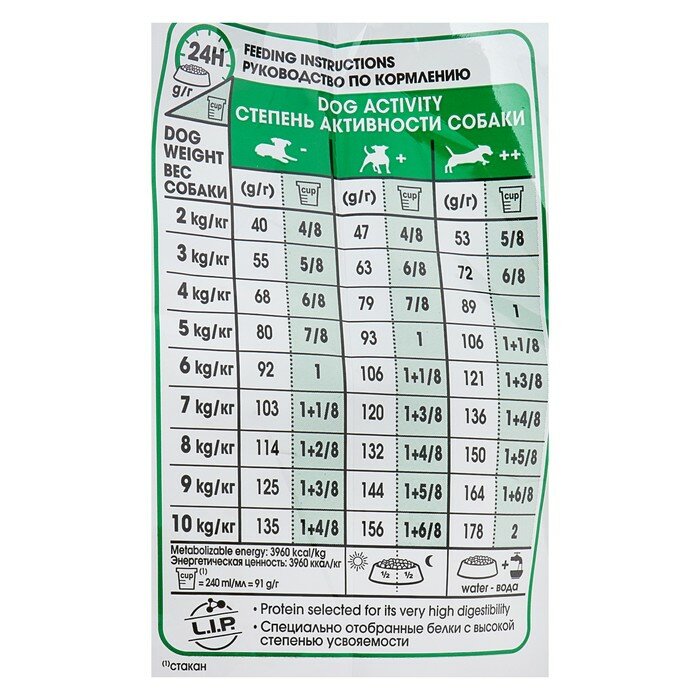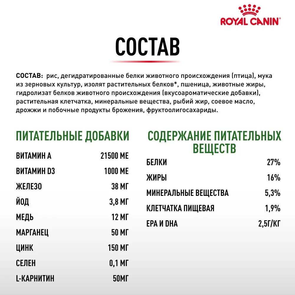 | Состав | рис, дегидратированные белки животного происхождения (птица), мука из зерновых культур, изолят растительных белков, пшеница, животные жиры, гидролизат белков животного происхождения (вкусоароматические добавки), растительная клетчатка, минеральные вещества, рыбий жир, соевое масло, дрожжи и побочные продукты брожения, фруктоолигосахариды |