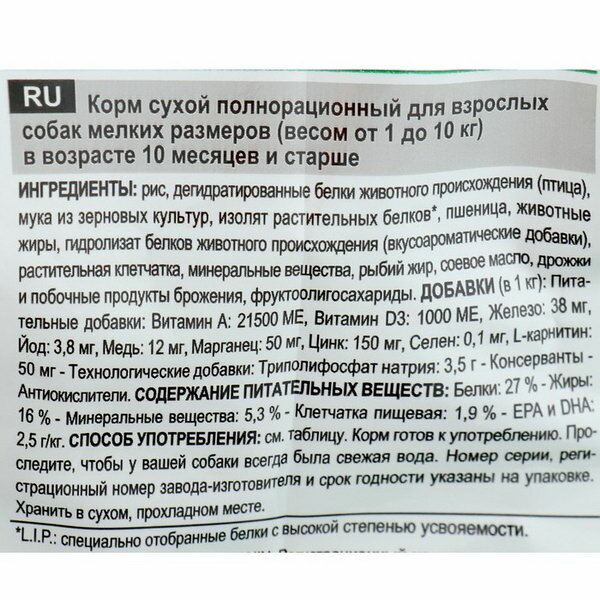 | Состав | рис, дегидратированные белки животного происхождения (птица), мука из зерновых культур, изолят растительных белков, пшеница, животные жиры, гидролизат белков животного происхождения (вкусоароматические добавки), растительная клетчатка, минеральные вещества, рыбий жир, соевое масло, дрожжи и побочные продукты брожения, фруктоолигосахариды |