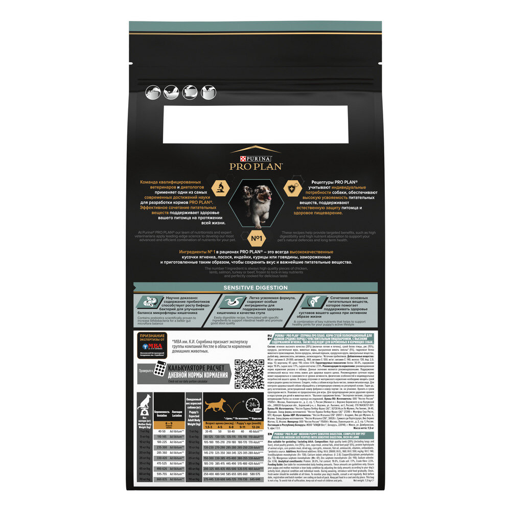 PRO PLAN PUPPY MEDIUM SENSITIVE DIGESTION для щенков средних пород с чувствительным пищеварением с ягненком и рисом (1,5 кг)