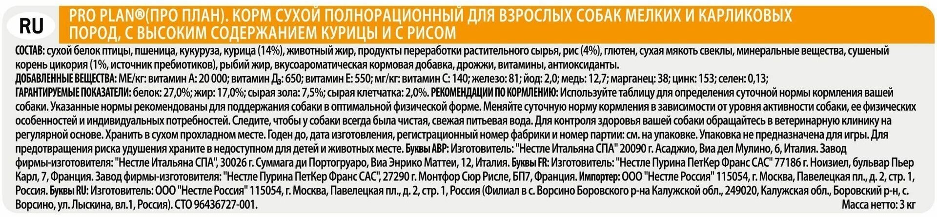 Сухой корм Purina Pro Plan для взрослых собак мелких и карликовых пород, курица с рисом, 3кг