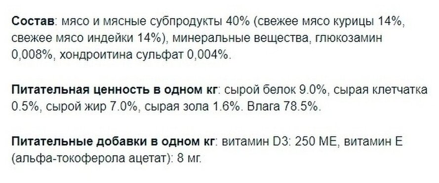 | Состав | старый: мясо и мясные субпродукты 40% (из которых мяса курицы мин. 4,2%, мяса индейки мин. 4,2%), витамины, минеральные вещества, МСМ (метилсульфонилметан) 80 мг/кг, глюкозамин 80 мг/кг, хондроитин 40 мг/кг; новый: мясо и мясные субпродукты 40% (свежее мясо курицы 14%, свежее мясо индейки 14%), минеральные вещества, глюкозамин 0,008%, хондроитина сульфат 0,004% |