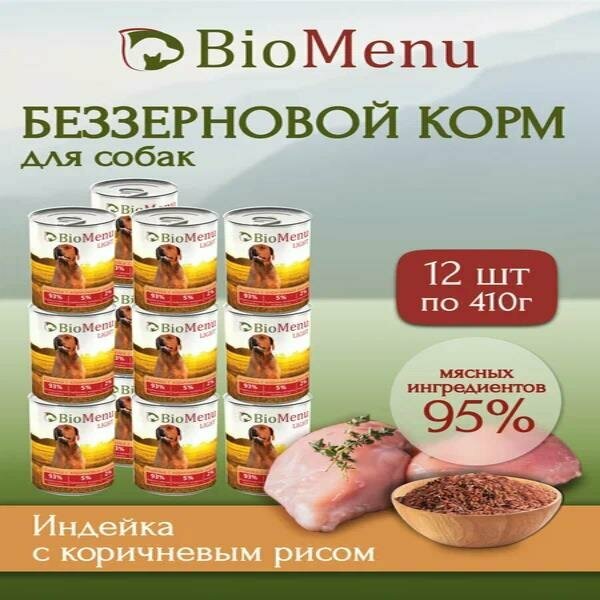 BioMenu LIGHT Консервы для собак Индейка с коричневым рисом 93%-мясо 410г (12шт)
