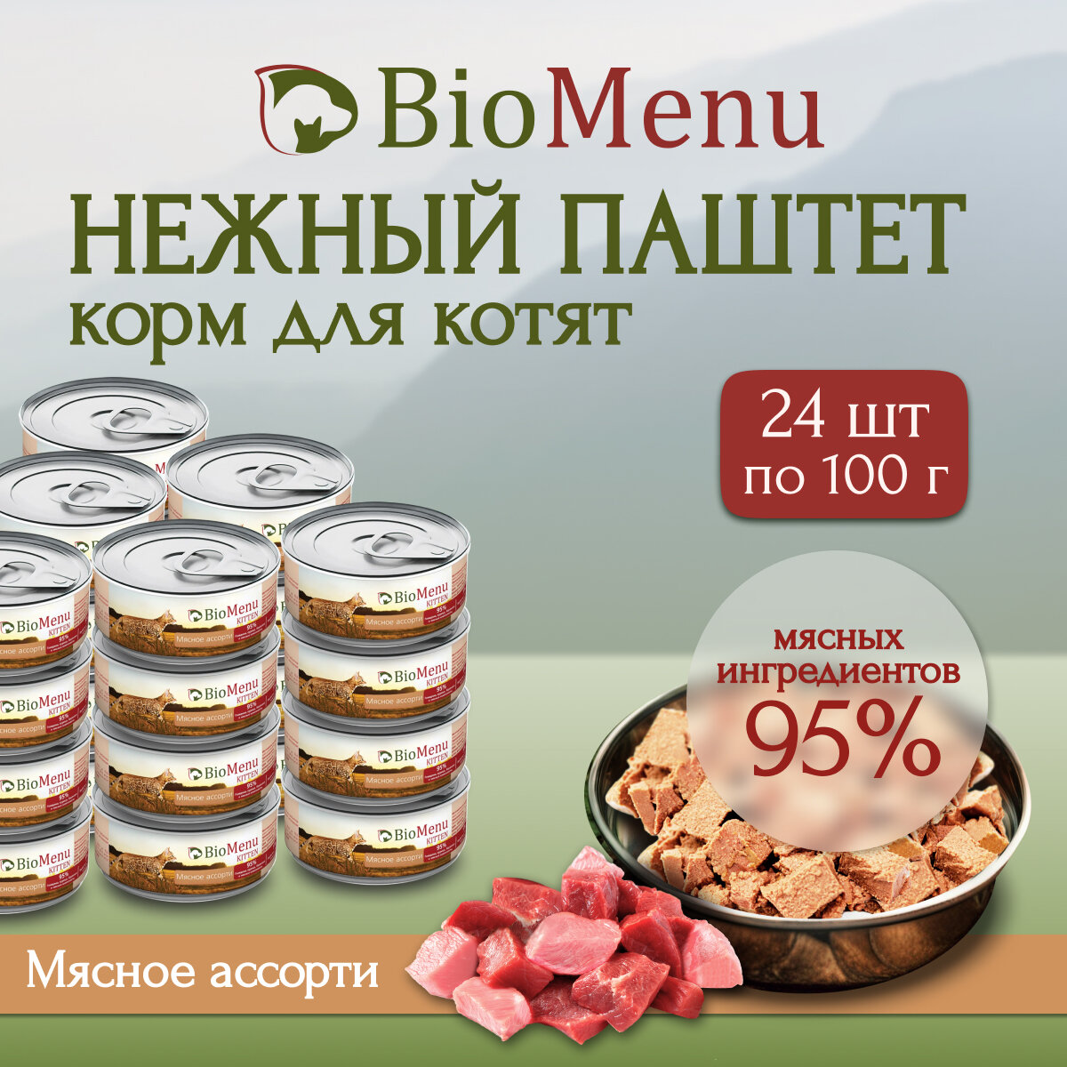 BioMenu KITTEN Консервы д/котят паштет Мясное ассорти 95%-мясо 100гр x 24 шт