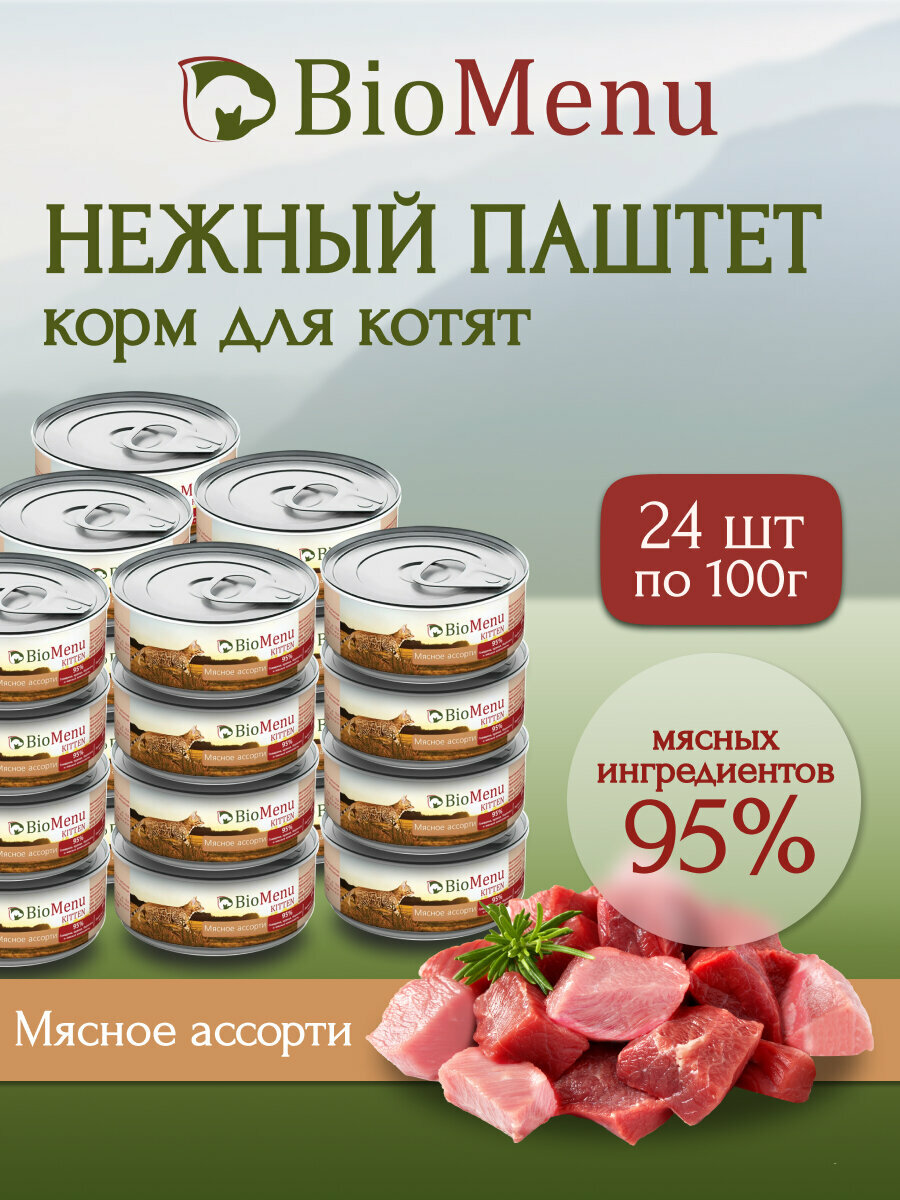 BioMenu KITTEN Консервы для котят паштет Мясное ассорти 95%-мясо 100г (24шт)