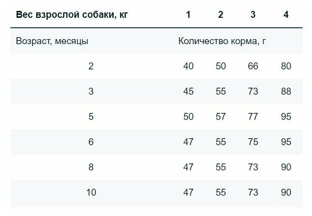 | Дополнительная информация | содержит: натуральный экстракт каштана, экстракт артишока, смесь из токоферолов и экстракт розмарина обыкновенного; рекомендации по кормлению: щенкам в возрасте от 2 до 12 месяцев размачивать продукт теплой водой за несколько минут до кормления; суточная норма должна быть разделена на 3–4 кормления |