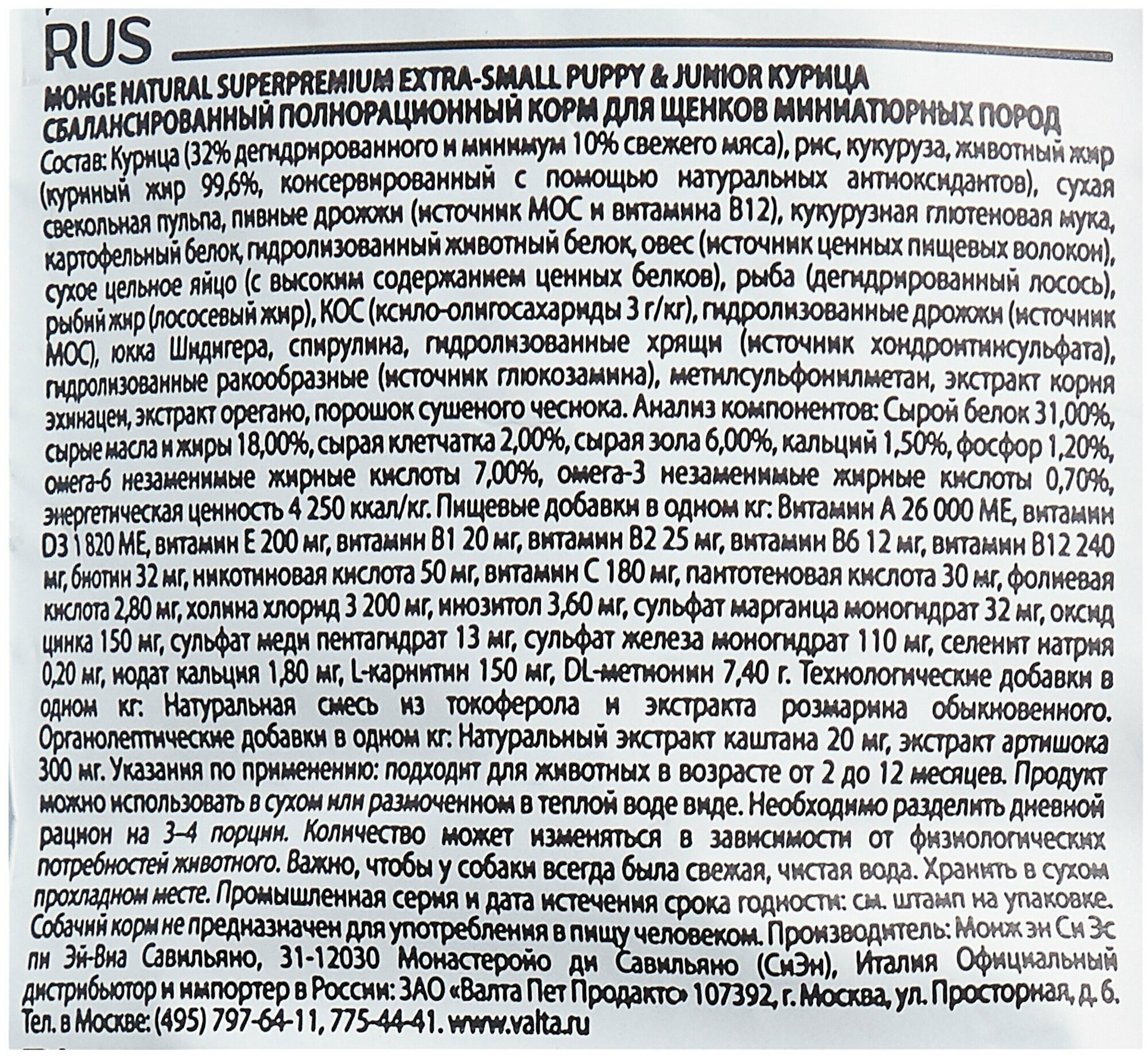 Сухой корм Monge Dog Extra Small для щенков миниатюрных пород, с курицей, 800 г