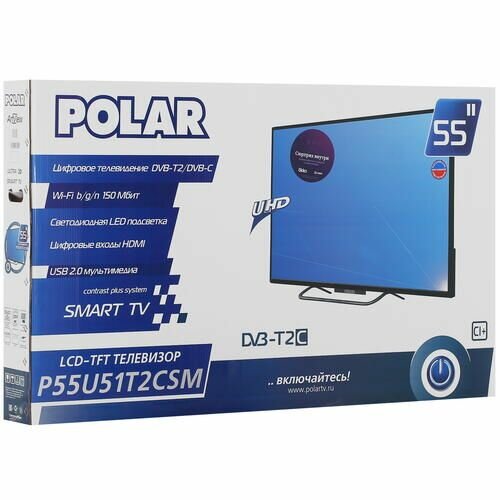 Телевизор POLAR P55U51T2CSM, 55, SMART, UHD, 50-60Hz, 16:9, DVB-T2 / DVB-T / DVB-C , CI+ slot, USB CINEMA HD ( mkv, mp4, avi, mov, XviD, MPEG4, JPEG)