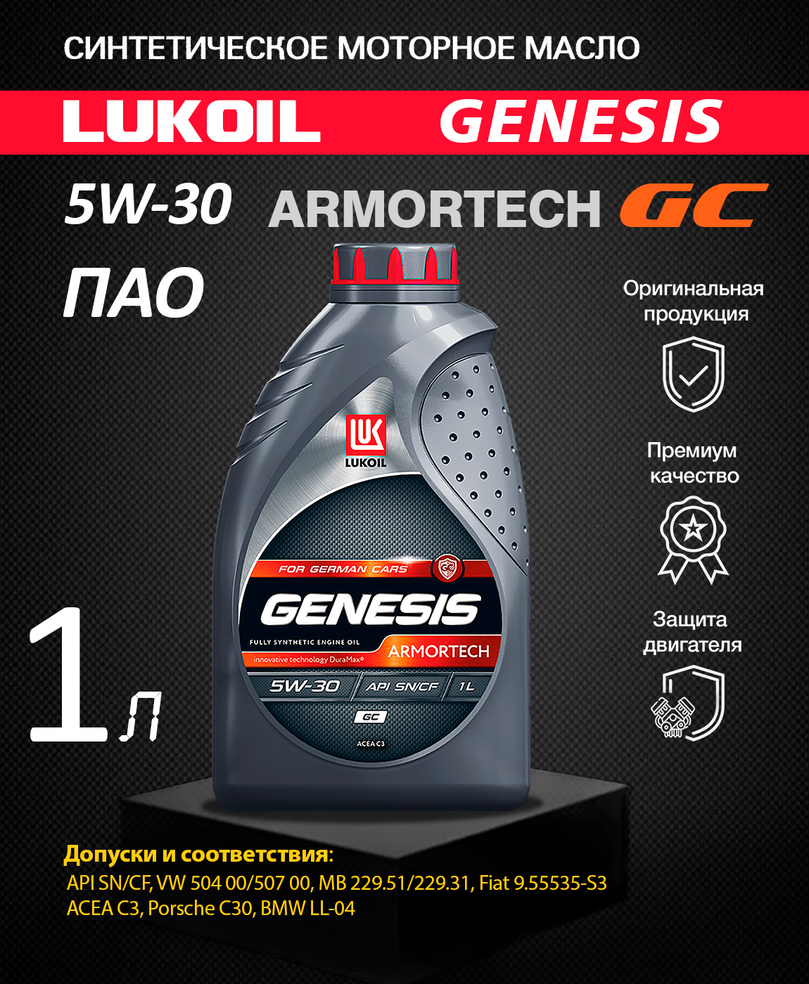лукойл genesis armortech gc 5w-30 (1л) api sn acea c3 vw 504 00/507 00 bmw ll-04 mb-approval 229.51 porsche c30